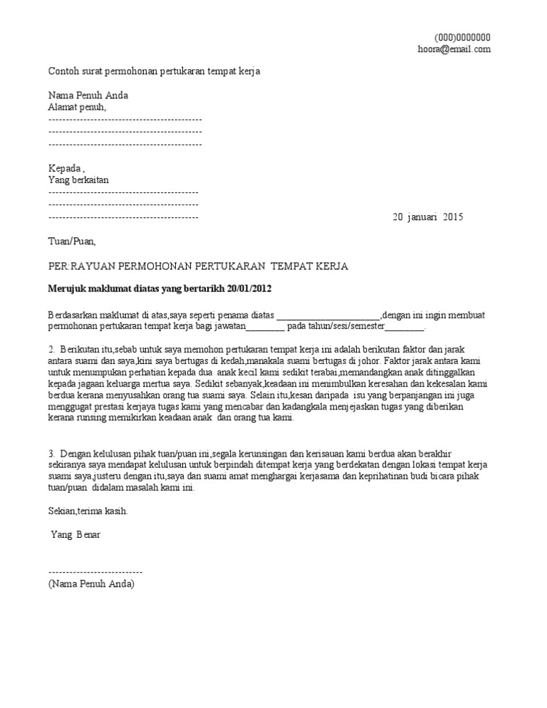 Contoh Surat Pertukaran Tempat Kerja Word from lh4.googleusercontent.com Surat lamaran kerja adalah surat yang dibuat dan ditujukan kepada suatu perusahaan atau perorangan dengan maksud untuk melamar pekerjaan. Sebaiknya anda mengurus surat pindah sebelum melahirkan supaya dalam pembuatan akta kelahiran anak menjadi mudah. Saya sudah lama bertempat tinggal bersama keluarga di membang muda; Untuk meminta izin atas ketidakhadiran kita di tempat kerja, tidak cukup hanya meminta izin secara lisan namun juga harus dilengkapi dengan surat izin tidak untuk anda yang masih bingung dengan format atau susunan surat izin tidak masuk kerja silahkan melihat penjelasannya seperti di bawah ini. In these page, we also have variety of images available. Surat pindah ini tidak hanya berlaku untuk data kependudukan saja, melainkan juga untuk urusan administrasi lainnya. Halo sahabat kampung ini adalah cara urus surat pindah yg cepat dan benar.sebelum kalian urus surat pindah simak video tutorial ini ,agar saat mau. Surat pindah kerja kkm alasan pertukaran tempat kerja kerajaan contoh surat permohonan mutasi kerja babyzimmer idee babyzimmer ideen.